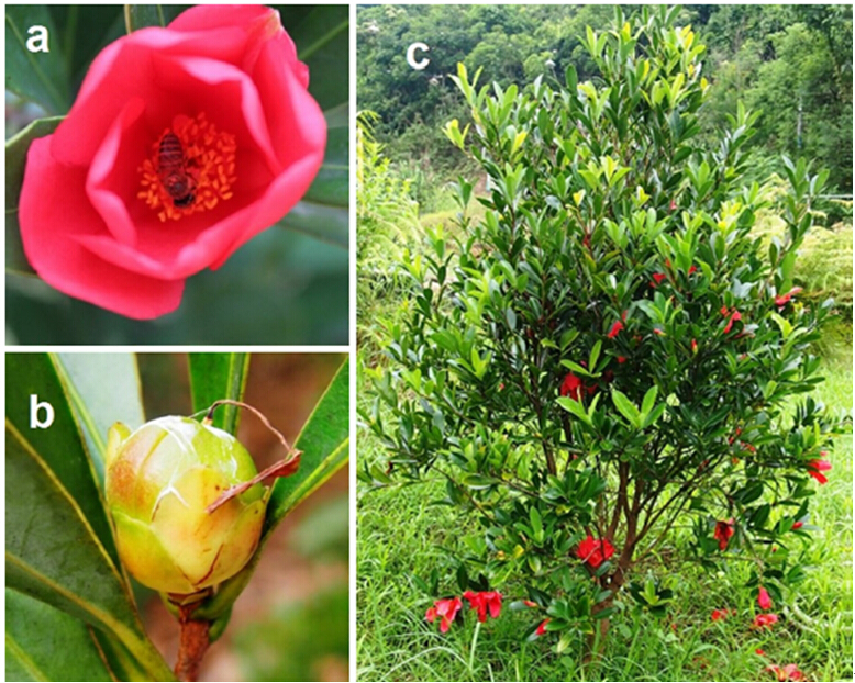杜鹃红山茶Camellia changii(图2)是华南植物园卫兆芬研究员发现的新种,是优良的观花类园林植物。目前,该种仅在广东阳春鹅凰嶂省级自然保护区分布着1000多株野生个体,任海等研究人员与该保护区合作,在前期进行野外调查研究的基础上,对所有野生个体通过嫁接苗的方式保育遗传多样性,成功开展了回归试验。此后,任海等与美国佛罗里达国际大学刘虹博士、华南植物园于慧博士等合作,开展了回归植株传粉及种子生产的研究,发现本地回归和异地回归植株的传粉种类虽有不同,但最终结果相似。这表明虫媒自交不亲和珍稀植物可能有一定的抗全球变化能力。该研究成果近期发表在国际期刊Plant Ecology上(链接http://link.springer.com/article/10.1007/s11258-015-0515-3)。