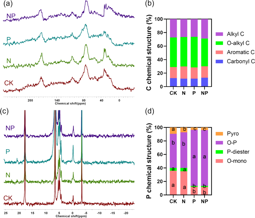 注:土壤¹³C NMR谱图(a)、碳化学组分(b)、³¹P NMR谱图(c)及磷化学组分(d)。Pyro,焦磷酸盐磷;O-P,正磷酸盐磷;P-diester,磷酸二酯磷;O-mono,磷酸单酯磷。CK,不施肥;N,施氮肥;P,施磷肥;NP,氮磷肥配施。