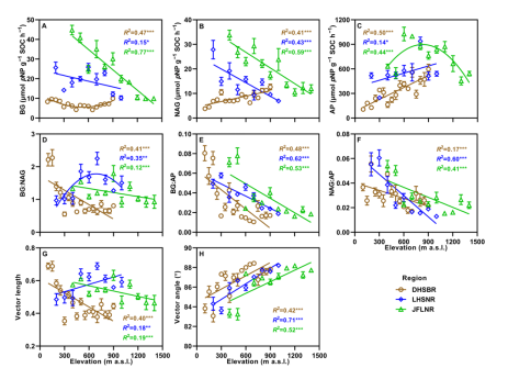 研究团队以广东和海南三条典型热带森林海拔梯度为研究对象,覆盖海拔范围约100—1400米,通过测定土壤胞外酶活性及其化学计量关系,定量评估了微生物对碳、氮和磷的代谢限制格局。结果表明,在不同区域和植被类型下,土壤微生物代谢均呈现显著的磷限制特征,且随着海拔升高、温度降低,微生物对磷的供需失衡程度进一步加剧;相比之下,微生物碳限制整体水平较低,且沿海拔梯度的变化趋势并不一致。