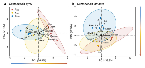 图1 甜槠(a)与鹿角锥(b)的功能性状沿海拔梯度的协同变化