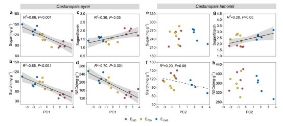 图2 沿海拔梯度的性状共变轴与非结构性碳水化合物(NSCs)的相关性